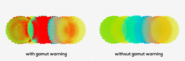 The color gamut describes the full range of colors that the printer can reproduce. If a spot color cannot be reproduced within the user-specified tolerance, Rebelle will show you the gamut warning: