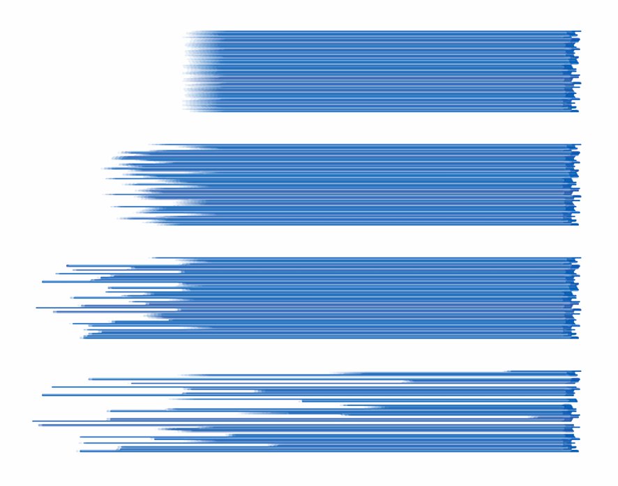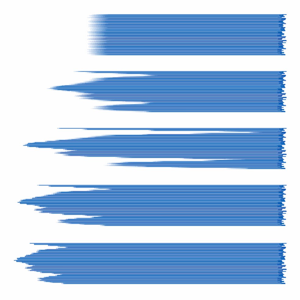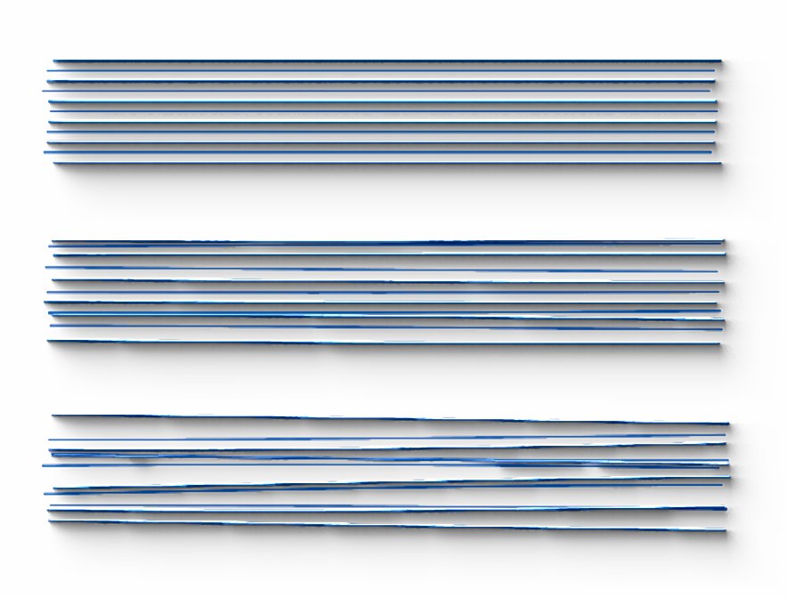 Noise Frequency - Using Perlin noise, this setting controls the size of bristle groups that have similar behavior. (0-100) For example, bristles within a brush can behave differently in how they scratch the surface of the paper or how they react to mixing, blending or painting based on the pressure. At 0, brush will contain all bristles using the same values, while with higher values you can see several groups of bristles.