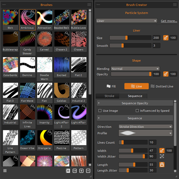 A thin flat brush profile of parallel paths with a defined width. Place varied graphic elements on the trajectories and experience a vast array of possibilities how paths can act - as a trace of a traditional flat drawing tool, linear structure or a graphic pattern.