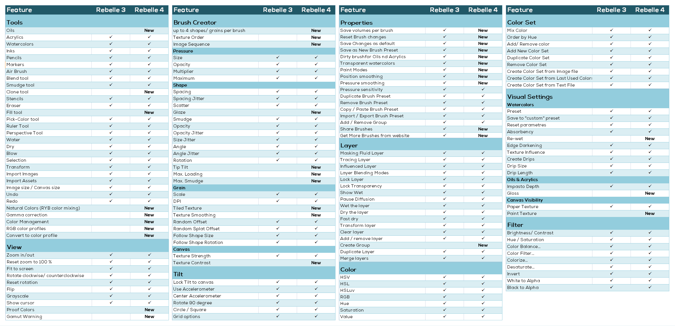 For a detailed comparison of all features in Rebelle 3 and 4, please see the table below.