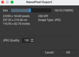 Below the Size slider, you can see the information about the size of the image in pixels, cms and inches. Click OK to export the image with NanoPixel.