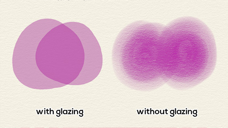 Glaze - Turn the glazing on to build up the transparent layers of pigment on the canvas, limited by the Opacity slider in the Properties panel. Glazed strokes are used on top of one another to build up depth and modify colors in a painting: