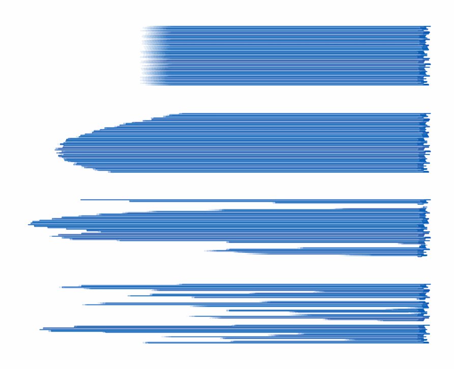 Noise Frequency - Using Perlin noise, this setting controls the size of bristle groups that have similar behavior. (0-100) For example, bristles within a brush can behave differently in how they scratch the surface of the paper or how they react to mixing, blending or painting based on the pressure. At 0, brush will contain all bristles using the same values, while with higher values you can see several groups of bristles.