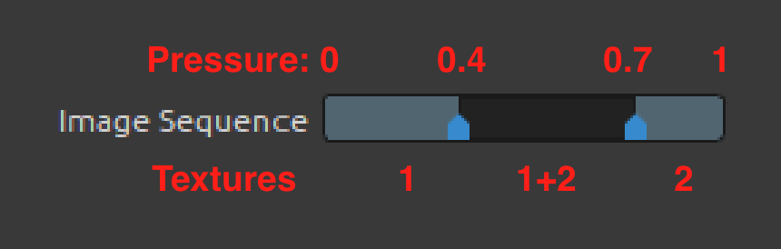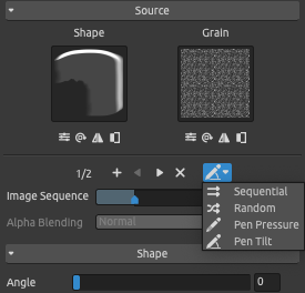 Texture Order based on Pen Pressure - The "Image Sequence" slider changes from an ordinary slider to a range slider. See below an example with 2 textures (two shapes and two grains in one brush preset):