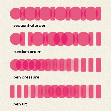 Texture Order based on Pen Tilt - Similar to Pen Pressure but this time which shape & grain combination will appear is selected based on the pen tilt. With no pen tilt (the pen is perpendicular to the surface of the drawing tablet) it picks shape(s) & grain(s) from the middle of the slider, in the example above it would result in a mix between the first pair of shapes & grains with the second ones.