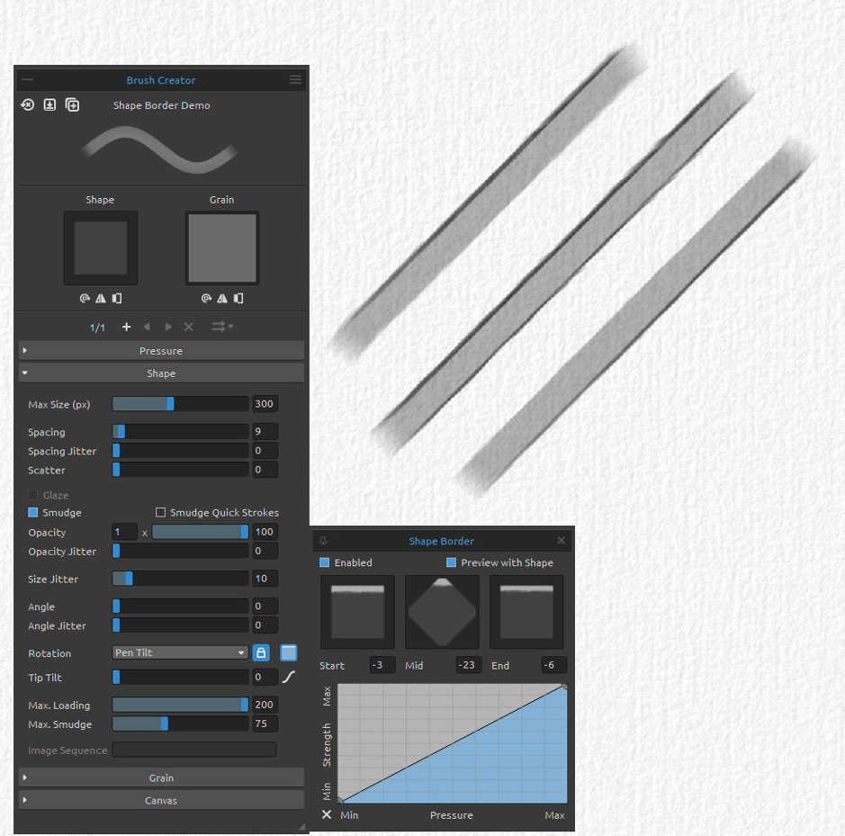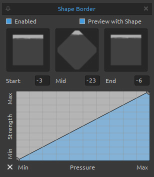 Enable 'Preview with Shape' to preview the border on the brush shapes in different angles and 'Start', 'Mid' and 'End' controls to fine-tune the border position.