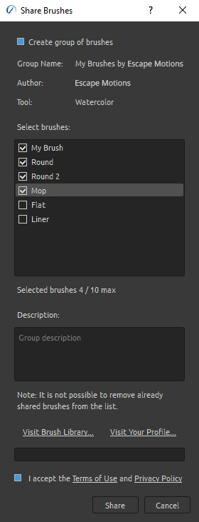 Confirm by clicking the "Share" button. The selected brushes or a brush group will be automatically uploaded to the online Brushes Library for other Rebelle artists to use.