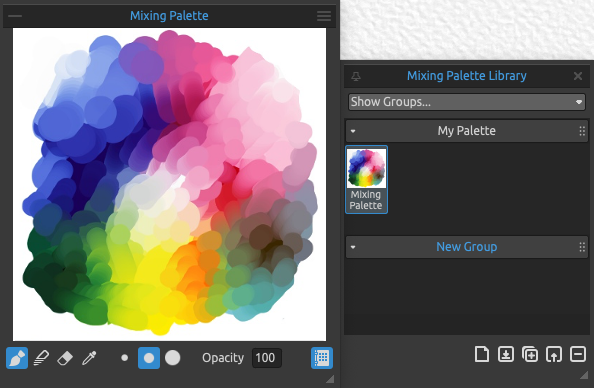 Right-click in the Mixing Palette Library to add a new group or delete the selected group of palettes. Rename the group by double-clicking its name, enter the new name of the group and hit Enter. Hide the group using one left mouse button click.