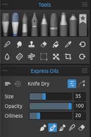 The Size, Loading, and Oiliness of the express oils brushes are set in the Properties panel. The detailed mechanics that define the brush are set in the Brush Creator panel.