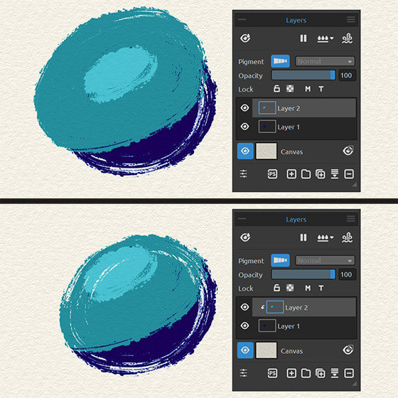Clipping Mask - Control the visibility of a layer using the content and transparency of another layer. To create a clipping mask, we need two layers. Add a clipping mask by right-clicking the top layer and selecting 'Add Clipping Mask'. The bottom layer controls the visibility of the layer above it. The bottom layer becomes the mask, and the layer above it is the layer that's clipped with the mask below.