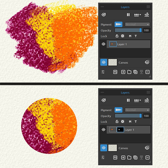 Rebelle offers several ways of creating a mask on the layer: Clipping Mask, Layer Mask, Masking Fluid layer, Stencils and Selections: