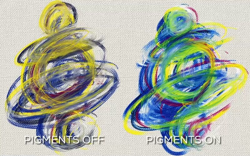When Pigments are enabled, the colors mix and blend together on the layer as well as blend with the layers below. When Pigments are disabled, the blending changes.