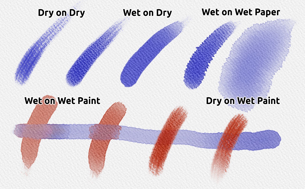 When painting with a wet medium (watercolor, acrylic and ink pen) you can set the amount of water to be used. With more water, the color will spread faster on the layer and wet colors are mixed.