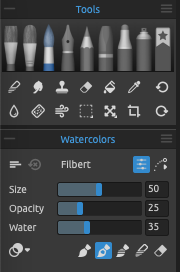 Activate the Watercolor tool by choosing it in the Tools panel or by tapping the Shift + W shortcut.